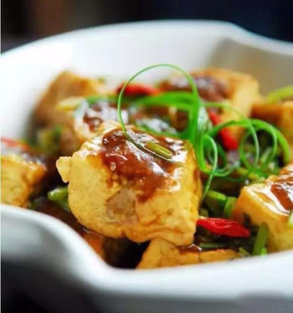 牛肉沫燒豆腐:將豆腐切成小塊,用開水焯過一遍,牛肉去筋切成肉沫,炒鍋燒開倒油,油燒熱后放入切碎的蔥花、牛肉沫煸炒,然后再放入焯水后的豆腐,加入鹽、糖、料酒、雞精、適量的水煮幾分鐘,起鍋前再加入勾芡好的淀粉即可。